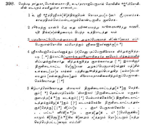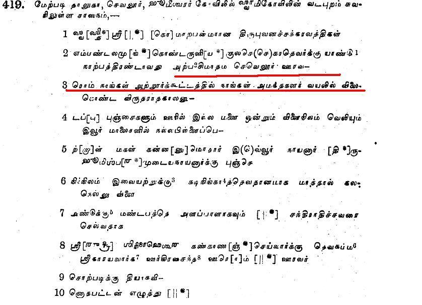 மாவலி வானாதிராயர் காரியத்திர்க்கு……….செவ்வலூர் உரவரும் வடபற்று நாட்டவரான  செவ்வலூரு பஞ்சவராயர் நரசிங்க தேவர் உள்ளிட்டோர்க்கும் சோழ்கோனார் பல்லவராயர் உள்ளிட்டார்க்கும் விரோதமான  செம்மயிர் விரோதமாய் வெட்டி…….