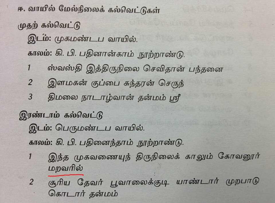 திருபுவன சக்கரவர்த்தி வீரபாண்டிய தேவர்க்கு யாண்டு……..கர்ப்பகிருகம் தளம் இசைப்பித்த இவ்வூர் மறவரில் கொவனூர் கூட்டத்து மாத்தன் நாட்டானான பொன்னம்பலம் காட்டிய கங்கன் தன்மம்.