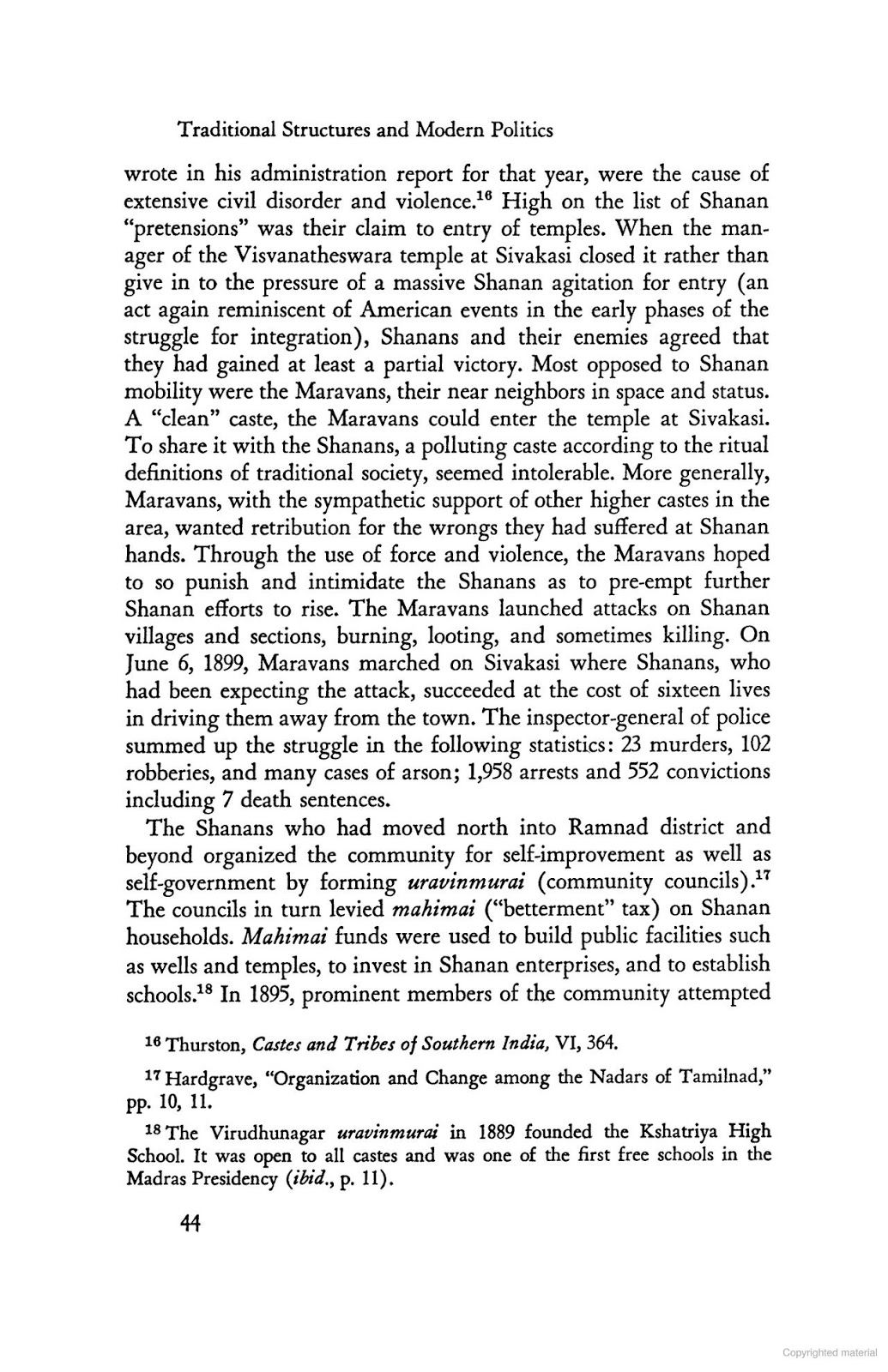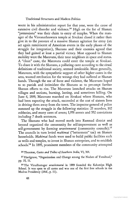 மதராஸ் மாகாணத்தில் காமராஜ் நாடார் என்பவர் காங்கிரஸ் கட்சியின் தலைவராக நேரு இறந்த பின் பொறுப்பில் இருந்தார். அவர் மூலமாக அவரது சமுதாயம் பல முன்னேற்றங்களை பெற்று வந்தது. கார்ல் மார்க்ஸ் சாணார் என்னும் சாதியையும் அவர்கள் இந்து மதத்தில் தீண்ட தகாதவர்களாக கள் இறக்கும் பனமேறிகளாக வாழ்கை நடத்தியவர்கள் என்று குறிப்பிடுகிறார். ஆனால் கடந்த அரை நூற்றாண்டுகளாக அவர்கள் பல அமைப்புகள் புதிய நடவடக்கைகள் மூலம் தங்களை உயர்ந்தவர்களாக காட்டி வருகிறார்கள்.