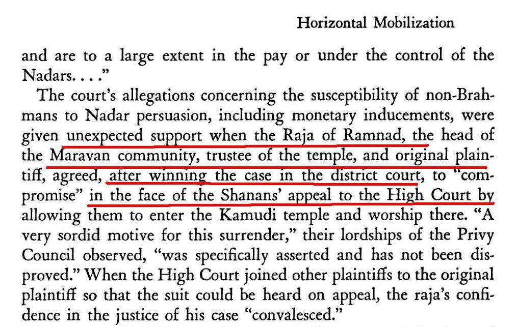 ஆனால் இந்த நீதிமன்றம் நாடார்களின் இதர முன்னேற்றங்களான தங்கள் பூர்வதொழிலை விட்டு பல துறைகளிலும் முன்னேறி தொழில் அதிபர்களாகவும் பல கிராமங்களில் நிலம் உடையவர்களாகவும் இருந்த நாடார்களின் செல்வ செழிப்பை பொருட்டாக கருதவில்லை. புதிதாக வைதீக சம்பிரதாயங்களை பின்பற்றியும் அதையும் நீதிமன்றம் கருதவில்லை.