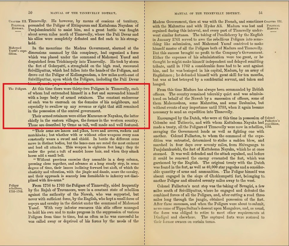 (History of tirunelveli by robert caldwell bishop) Most Marava palaiyams were contiguous units at the foot of the Eastern Ghats and were collectively known as the Western Bloc. Nayaka palaiyams (mostly in eastern Tirunelveli, Dindigul, and Coimbatore) constituted the so-called Eastern Bloc.only Marava and Nayaka have the paliyams in Tirunelveli. Each polegar “concentrated in his hands the exchange of money and the traffic of every merchantable article that was produced within the pollam’s limits. He also possessed the sole exercise of judicial authority, both civil and criminal, in the fullest extent.” “In areas of Marava and Vaduga [Telegu-speakers] settlement concentration, specific chiefs were recognized as the official heads of territorial segments of the [Nayaka] state. The largest of these palaiyakkarar domains … were those of Ettaiyapuram, Chokkampatti, Panchalamkurichi and Sivagiri.”