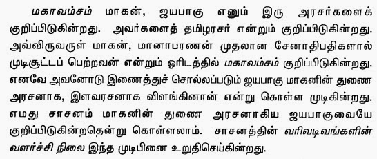Jayaweera refers to the marauding Kalinga King, Kalinga Magha, who invaded Sri Lanka and laid it waste, desecrating temples and dagabos in the Rajarata not sparing even the Ruwanvelisaya or the irrigation systems on which the ancient Sinhala civilization of Anuradhapura and Polonnaruwa was built. He displayed callous brutality in blinding and executing the incumbent ruler Parakrama Pandya. Jayaweera says the memory of such brutality is deeply ingrained in the collective subconscious of the Sinhala people and probably accounts for the prejudice they feel to the Tamils even today.