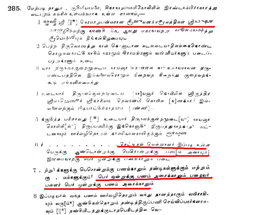 It shows Brahmins, Chettis and Vellalas were held equals and from the manual labourers like Pallas and Paraiyas 1/4 of what was levied from others (Kudumiyamalai) was collected.