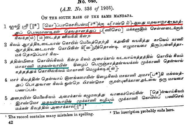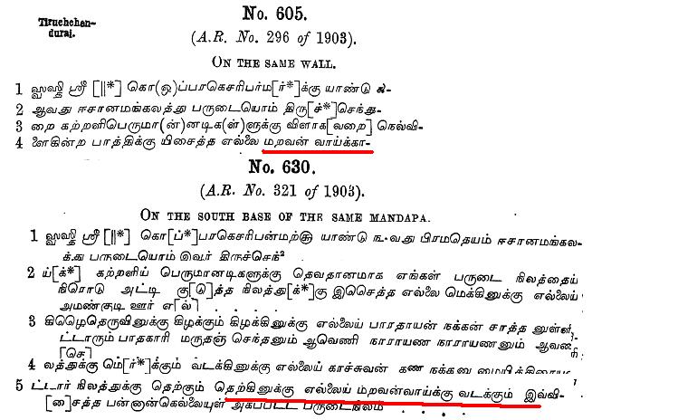 மன்னன்:முத்லாம் இராஜ இராஜ தேவர் காலம்:984 “ஸ்வஸ்திஸ்ரீ ராஜ ராஜ சோழ தேவர்…………….. …………….இராமன் மறவனும் தென்னவன்