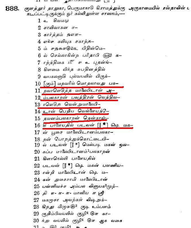 ஸ்வஸ்தி ஸ்ரீ கோச்சடை பன்மரான திரியுவன சக்கரவர்த்தி ஸ்ரீ சுந்தரபாண்டியத்தேவர்………………….இப்படிக்கு இவ்வூர் மறவன் நாராயன உய்யவந்த தேவர் தற்குறியும் இவ்வூர் மறவன் மாத்தன் மக்கனாயன் தற்குறியும்....இப்படிக்கு ஐநூற்றுவ பேரரையன் தற்குரியும்….