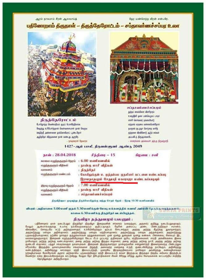 இராமநாதபுரம் சேதுபதி மகாராஜா சமஸ்தான தேவஸ்தான மண்டகப்படியில் எம்பெருமான் ஸ்ரீ கள்ளழகர் பூ பல்லாக்கு சிறப்பு பூஜை இராமதபுரம் மகாராஜா திருமிகு. குமரன் சேதுபதி அவர்களின் சார்பாகவும், இராமனாதபுரம் தேவஸ்தான,சமஸ்தான தர்மகர்த்தா இராணி R B K இராஜேஸ்வரி நாச்சியார் அவர்களின் சார்பாகவும், இராமனாதபுரம் சமஸ்தான திவான் திருமிகு.மகேந்திரன் அவர்கள் முன்னிலையில் வெகு சிறப்பாக நடைபெற்றது… இந்நிகழ்ச்சியில் மதுரை மாவட்ட ஆட்சித்தலைவர் திரு. வீரராகவ்ராவ் அவர்களும், வெள்ளியங்குன்றம் ஜமின் அவர்களும், மாவட்ட காவல்துறை துணை கண்காணிப்பாளர் திரு.மகேஷ்குமார் அகர்வாள் அவர்களும்,தேவஸ்தான,சமஸ்தான கண்காணிப்பாளர் திரு.விக்னேஷ் அவர்களும் மற்றும் பல்லாயிரக்கணக்காணபொதுமக்களும் கலந்துகொண்டு ஸ்ரீ கள்ளழகர் பூ பல்லாக்கு உற்சவம் சிறப்பாக