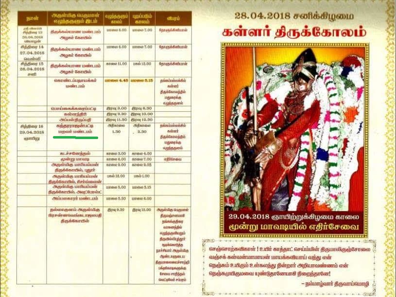 பெரிய மறவர் நாடு இராமநாதபுரம் சேதுபதி மகாராஜா மதுரை மண்டகப்படி யில் கள்ளழகர் அவர்களுக்கு 68 வகையிலான மூலிகைகள் மற்றும் பால் பன்னீர் புஷ்பங்கள் பழங்கள் சந்தனம் தேன் கல்கண்டு தயிர் மஞ்சள் தீர்த்தம் இவைகளை கொண்டு சிறப்பு அபிசேகம் செய்து சிறப்பாக பூசைகள் செய்து பக்தர்கள் அனைவருக்கும் பிரசாதம் மற்றும் சக்கரை பொங்கல், தக்களி, தயிர், புளிசதாங்கள் அரண்மனை சார்பில் வழங்கப்பட்டது 5 லட்சம் மேல் பக்தர்கள் கலந்து கொண்டு தரிசனம் செய்து அருளை பெற்று சென்றனர்……