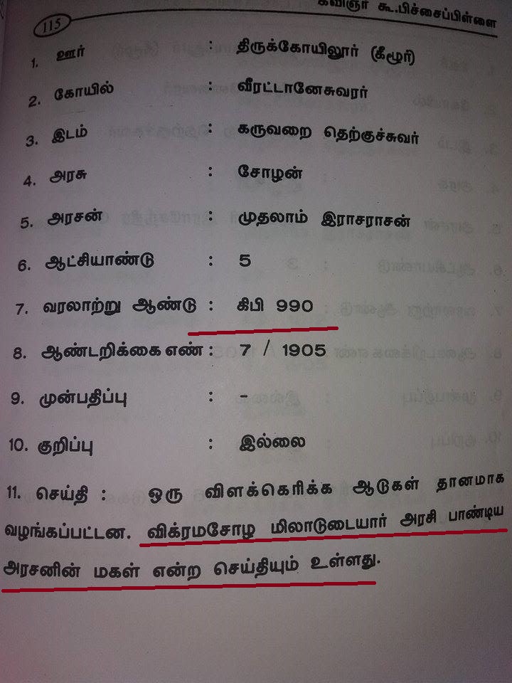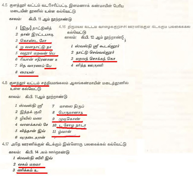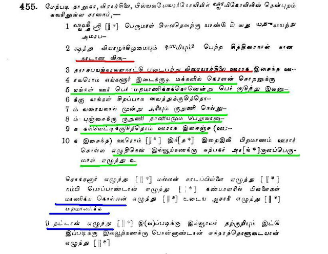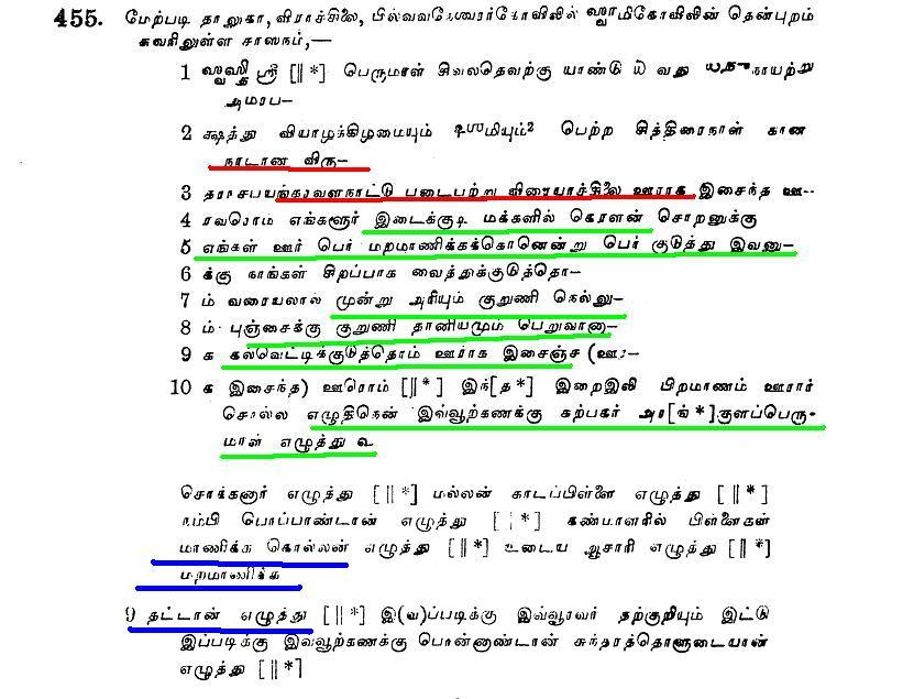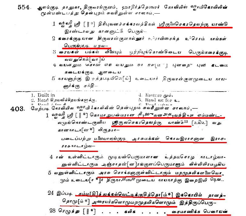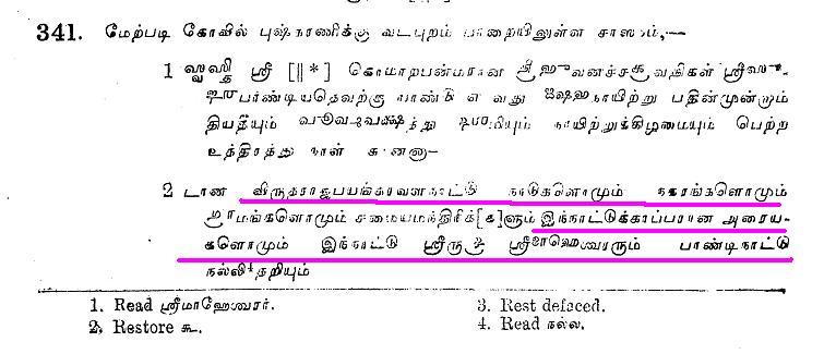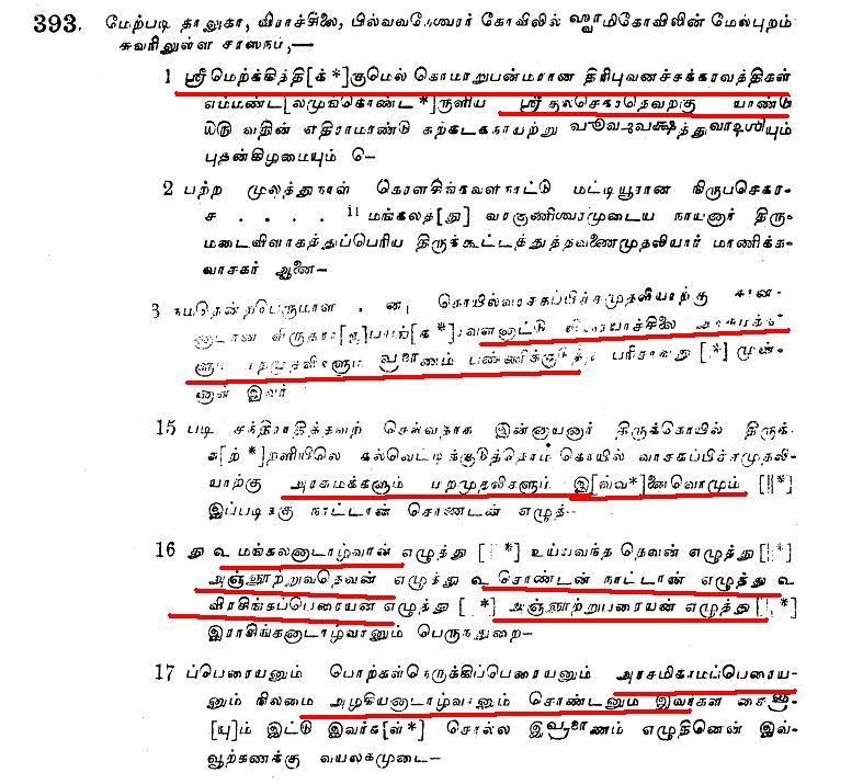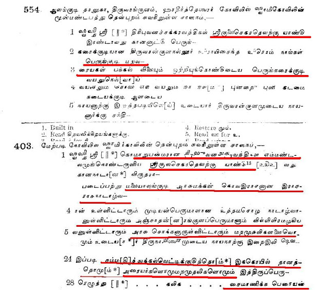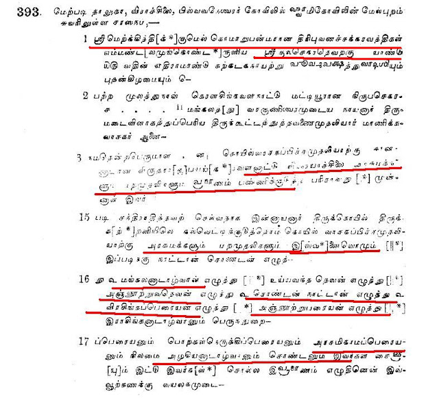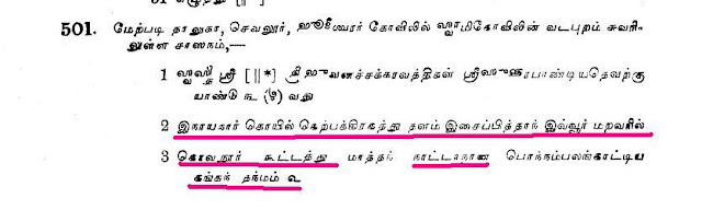 உதாரனமாக குளித்தலை தாலுகா வேமபனூர் திருமாலிஸ்வர் கோவில் பாண்டியன் குலசேகரரன் 14 ஆம் ஆண்டு கல்வெட்டில்.